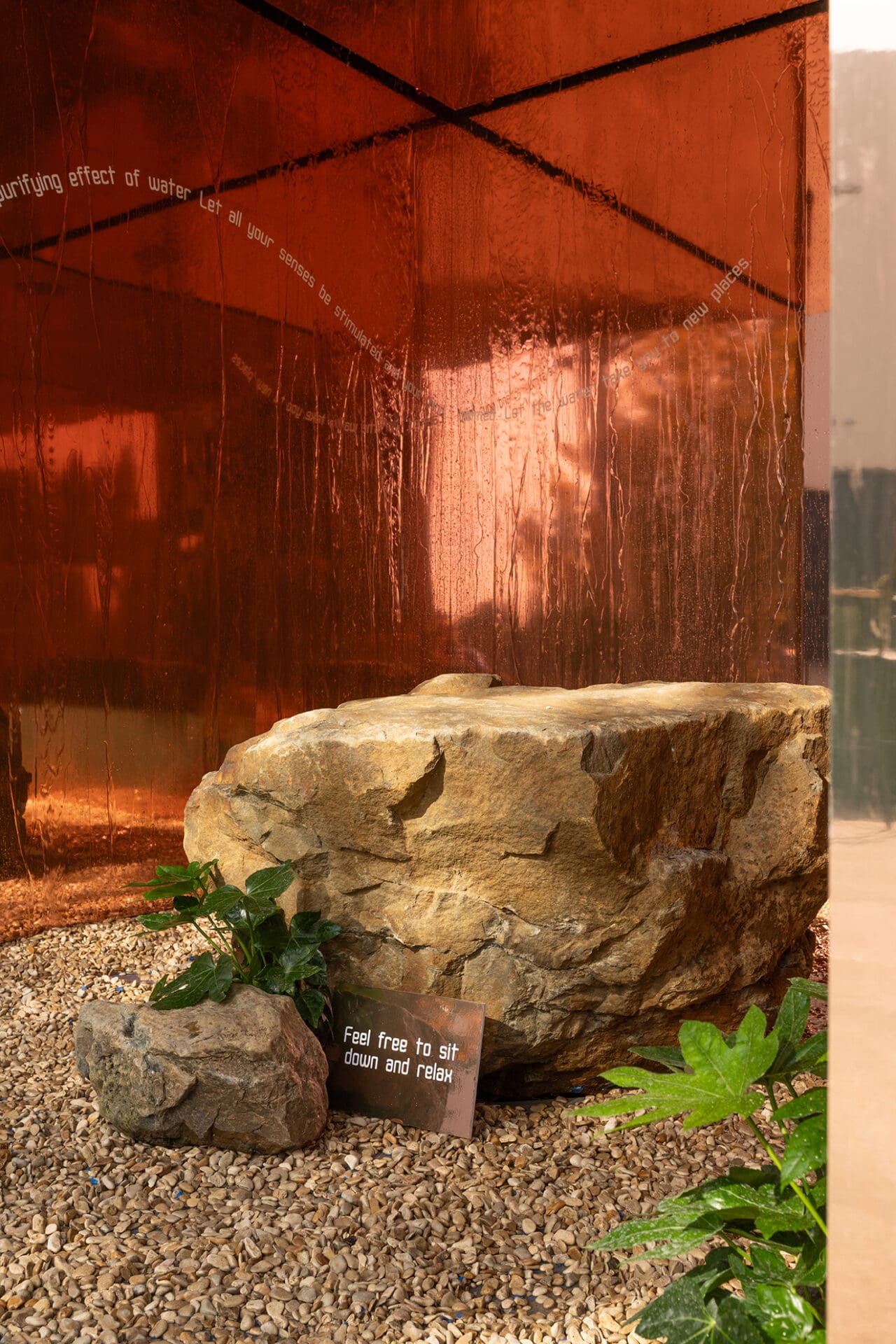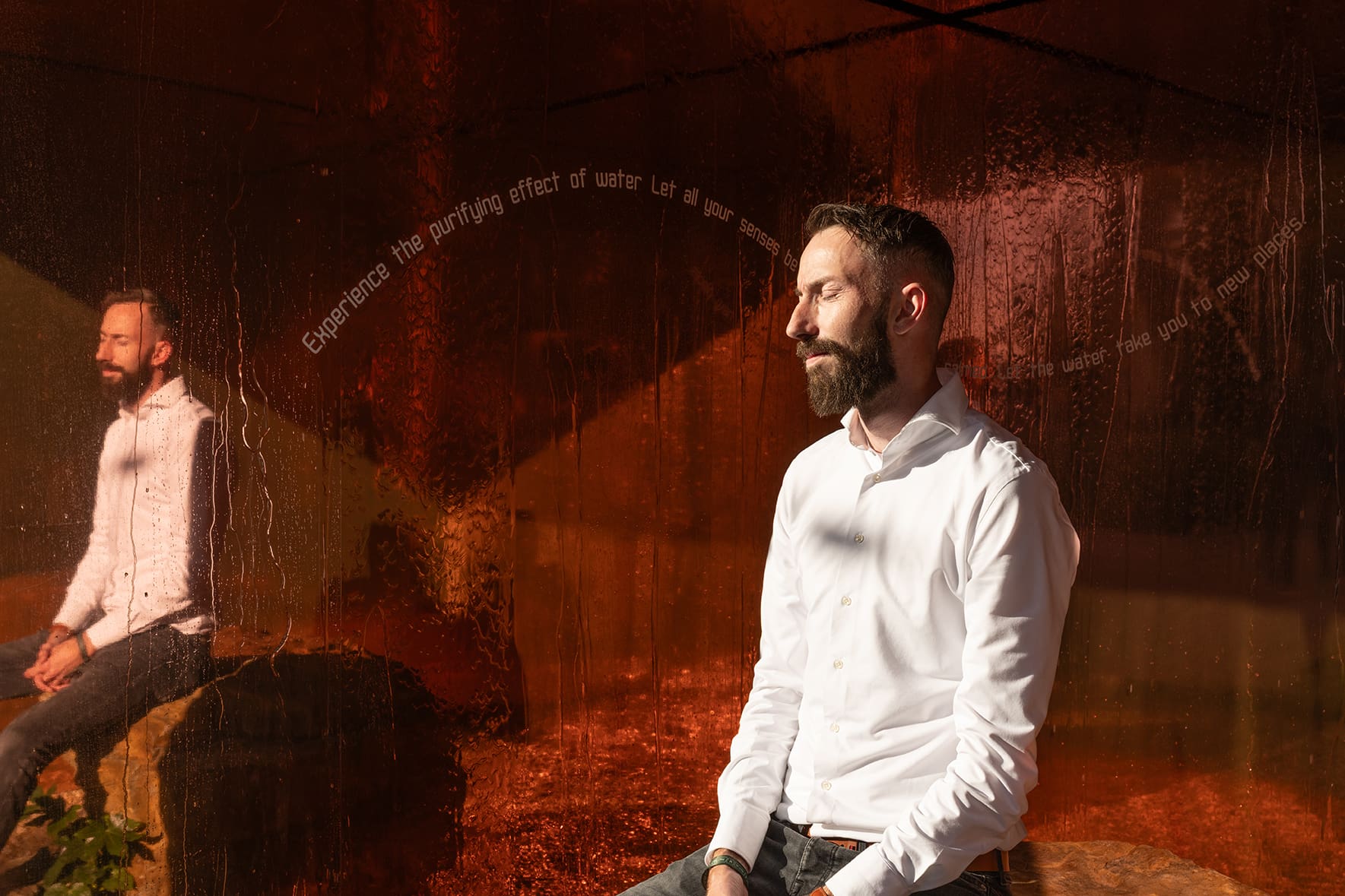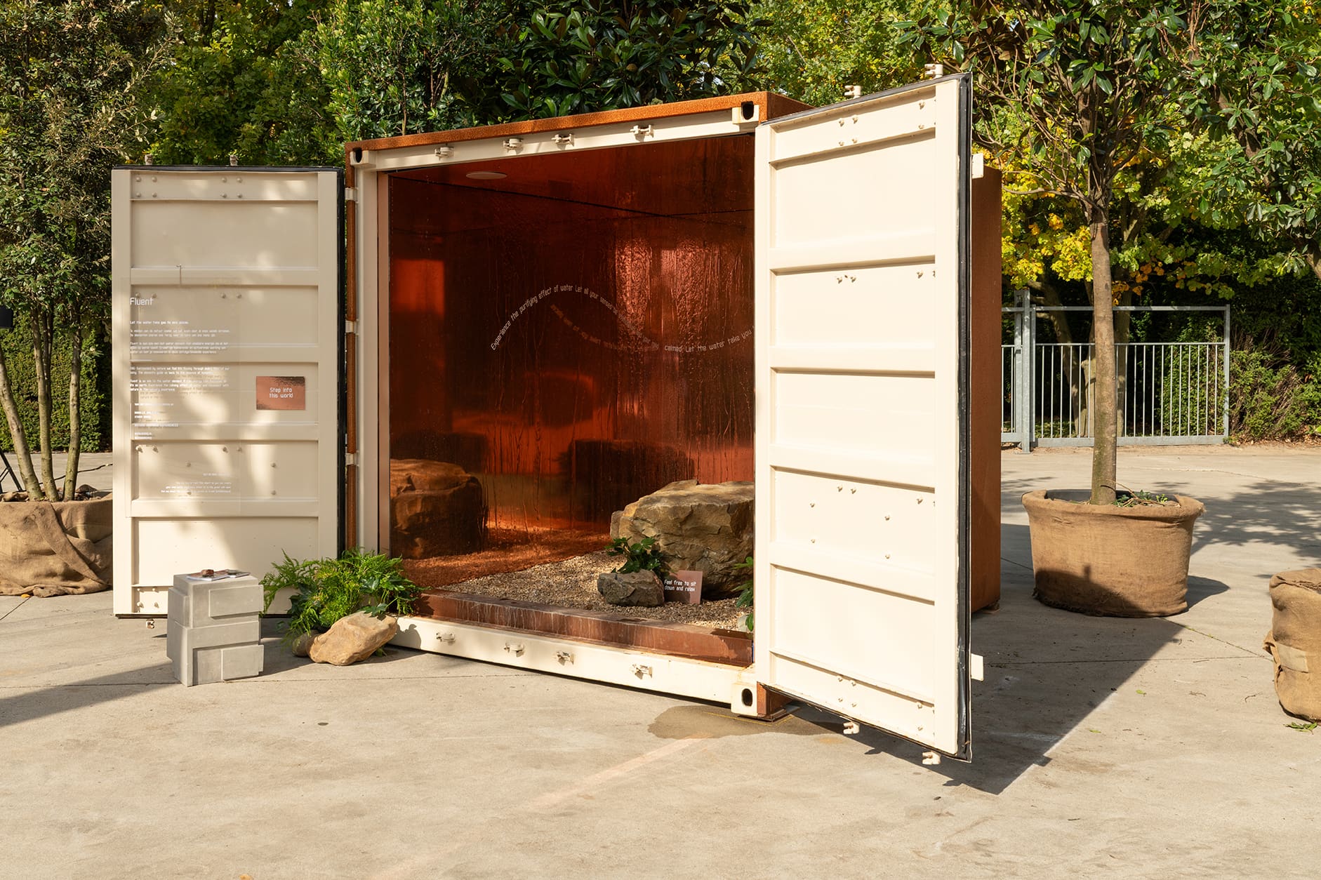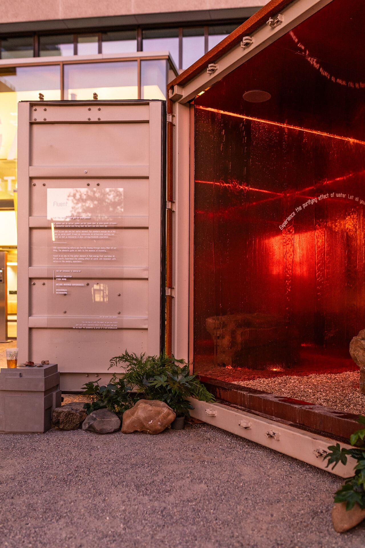 Met Fluent vertaalde ik de energie van het element water op een artistieke manier naar een Art experience. De strakke kubus van cortenstaal vormt een boeiend contrast met de wereld binnen die fluent is. Een zintuigprikkelend spel van reflectie, licht, water en geluid wakkeren je energie aan en brengen je geest tot rust.